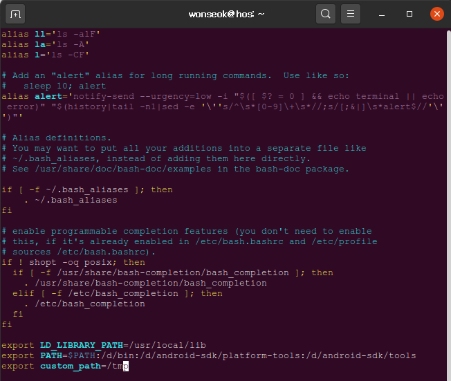 ". bashrc" 파일의 제일 마지막에 환경변수를 설정합니다.
