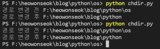 위와 같이 chdir.py 모듈이 위치한 경로는 최초 "F:/heowonseok/blog/python/os" 였으나
