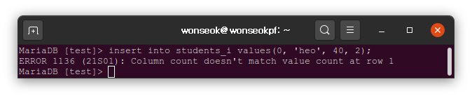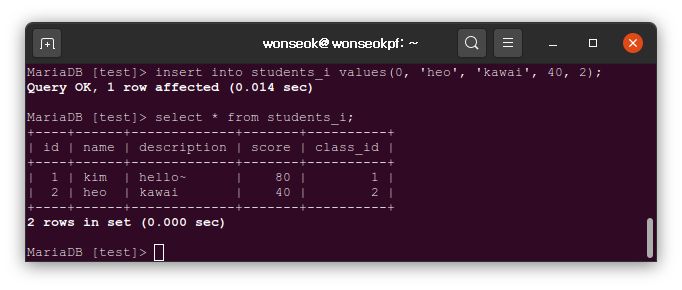 insert into students_i values(0, 'heo', 'kawai', 40, 2);