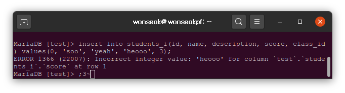 속성명을 지정한 경우 해당 값에 옳바른 값을 대입해야 합니다. 이번에는 int 형 속성인 score에 문자열 값을 대입해보겠습니다.