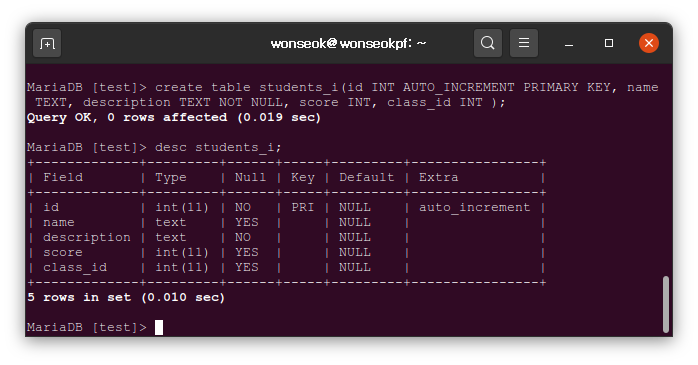 CREATE TABLE students_i ( id INT AUTO_INCREMENT PRIMARY KEY, name TEXT, desc TEXT NOT NULL, score INT, class_id INT );