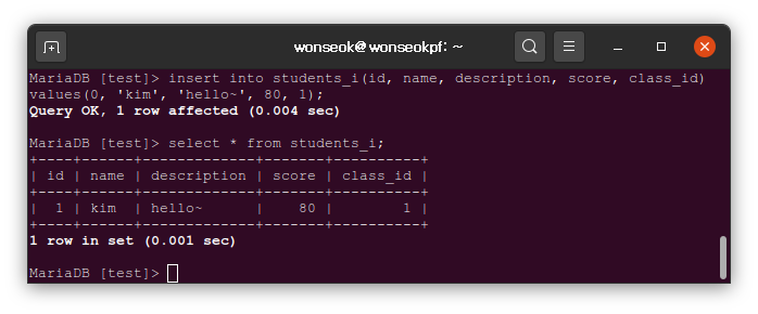 insert into students_i(id, name, description, score, class_id) values(0, 'kim', 'hello~', 80, 1);
