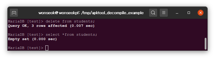 전체 데이터를 삭제하는 방법입니다. 이 명령이 실행된 후 테이블이 어떻게 변경되었는지 확인해보겠습니다.