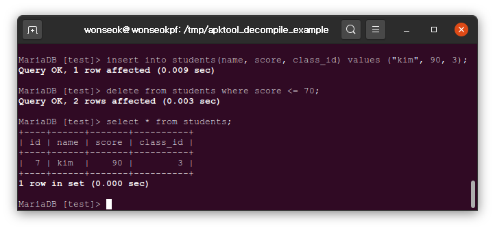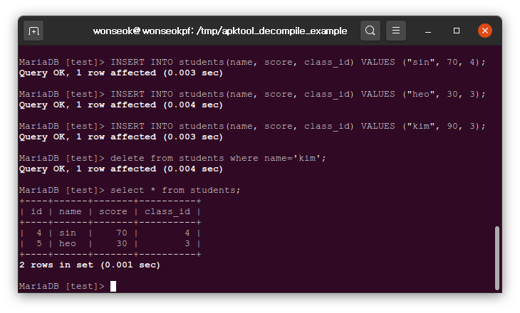 우리가 원하던 결과처럼 "kim" 학생의 데이터만 삭제된 것을 알 수 있었습니다.