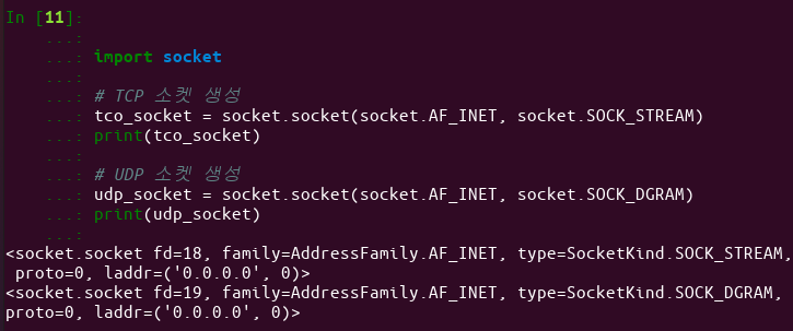 소켓 유형(Socket Type): socket.SOCK_STREAM: TCP 소켓을 나타냅니다.socket.SOCK_DGRAM: UDP 소켓을 나타냅니다.